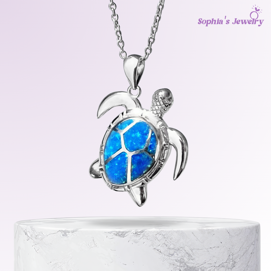 The Clara Blue Opal Sea Turtle Charm Silver Necklace showcases a unique blend of nature's beauty and silver craftsmanship. This necklace brings an elegant and meaningful touch to any outfit, perfect for ocean lovers.