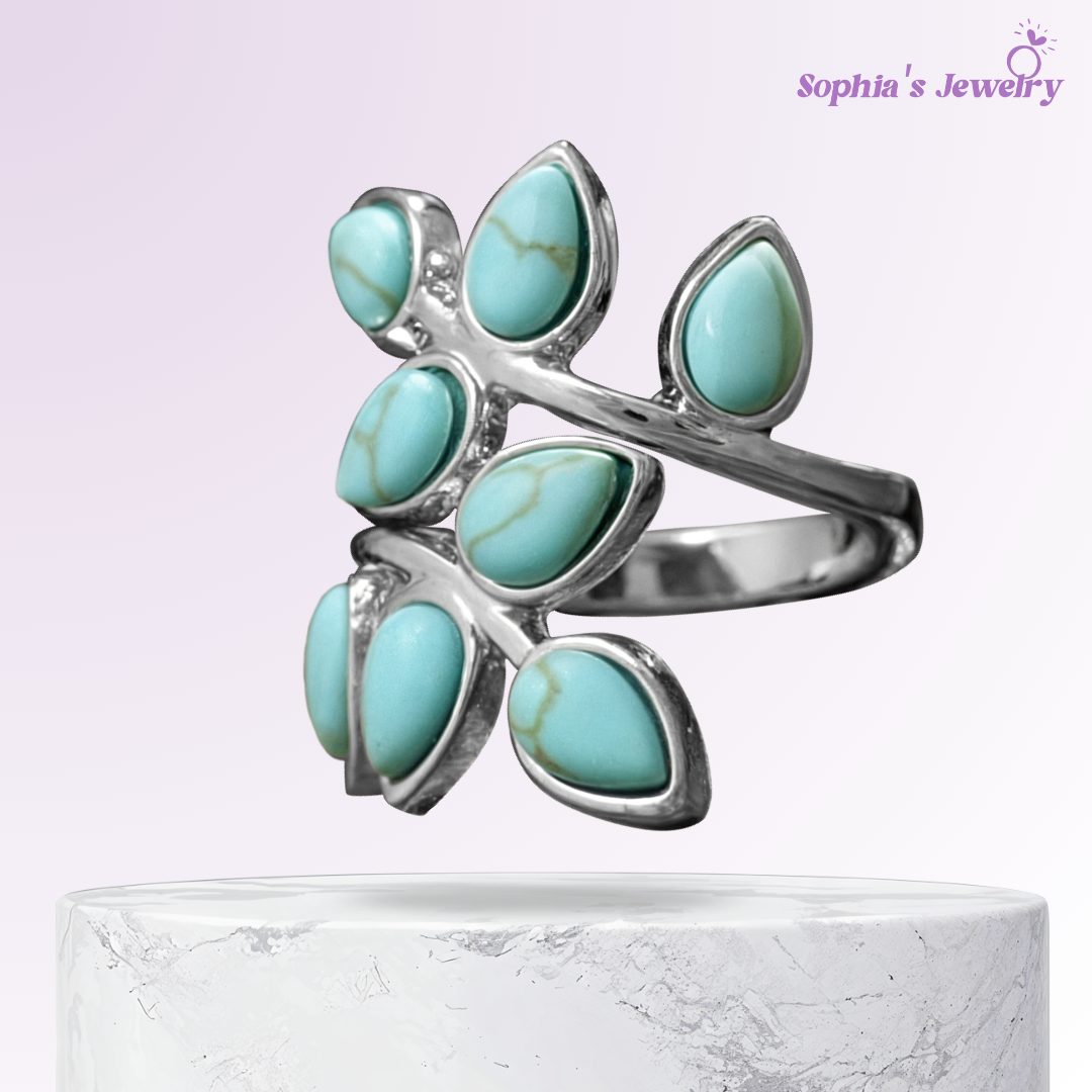The Liora | Turquoise Leaf Dance | Adjustable Silver Ring captures the gentle rhythm of nature with delicately sculpted leaves cradling vibrant turquoise stones. Set in lustrous 925 sterling silver, this design evokes a sense of movement and organic grace, like leaves fluttering in a soft breeze. The turquoise adds a refreshing pop of color, symbolizing tranquility and renewal.